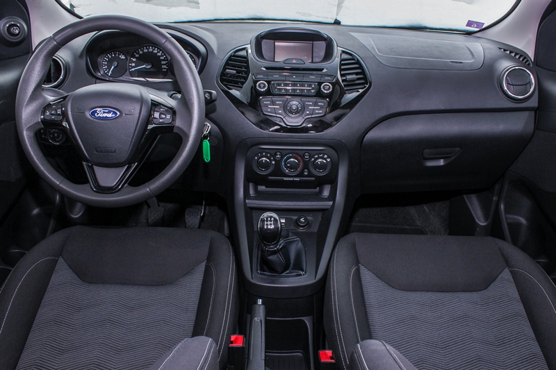 Tamna plastika sa kojom je obložena većina kabine je tvrda, pomalo monotona, mada ne i neprijatna na dodir, zahvaljujući reljefnoj površini. Lakirani crni umeci, koji su tu i tamo ubačeni da razbiju „crnilo“ unose dozu sjaja, ali se brzo maste pa je njihov estetski efekat upitan, ne samo u malom Fordu već i u znatno skupljim modelima. Analogni instrumenti su jednostavni i za nijansu premali da bi bili uzorno pregledni. Putni računar nudi sve neophodne podatke o stanju vozila, pređenom putu, autonomiji, trenutnoj i prosječnoj potrošnji... Vozač nema skalarni uvid u temperatru motora, a da se zagrijao Ka+ mu sugeriše gašenjem signalne lampice. Ugodnu vožnju, potpuno opremljeni testni model između ostalog omogućava zahvaljujući ručnom klima uređaju, audio sistemu sa Aux, iPod i USB kontaktima, električnim podizačima prednjih stakala, daljinskom centralnom zaključavanju, te multifunkcionalnim upravljaču sa komandama za audio sistem i limitator brzine. Tu je i još dosta korisnih sitnica, koje su manje-više standardne u savremenim automobilima istog cjenovnog razreda. Zanimljivo je da Ka+ osim prednjih i bočnih vazdušnih jastuka ima i vazdušne zavjese za oba reda sjedišta, što je pohvalno. Mnogo toga što nam se na početku testa učinilo skromnim i prejednostavnim kod Ka+ do kraja nam se nametnulo kao svjevrsni kvalitet više, jer se pažnja vozača puno više usmjerava na upravljač, mjenjač, sam put i okolinu, odnosno na sirovu automobilsku funkciju.Ko želi potpuno opremljeni Ka+ poput testnog do registracije će morati da izdvoji 23.500 KM. Za 600 KM više Ford istovremeno nudi najpovoljniju petovratnu verziju nove Fieste, koja se sa Trend opremom i 1,1-litarskim trocilindarskim motorom od 75 KS u ovom slučaju nameće kao najdirektnija konkurencija testnom Ka+ modelu, čija najveća prednost je u kompaktnijim gabaritima i činjenici da i „manje nekad može biti više“.