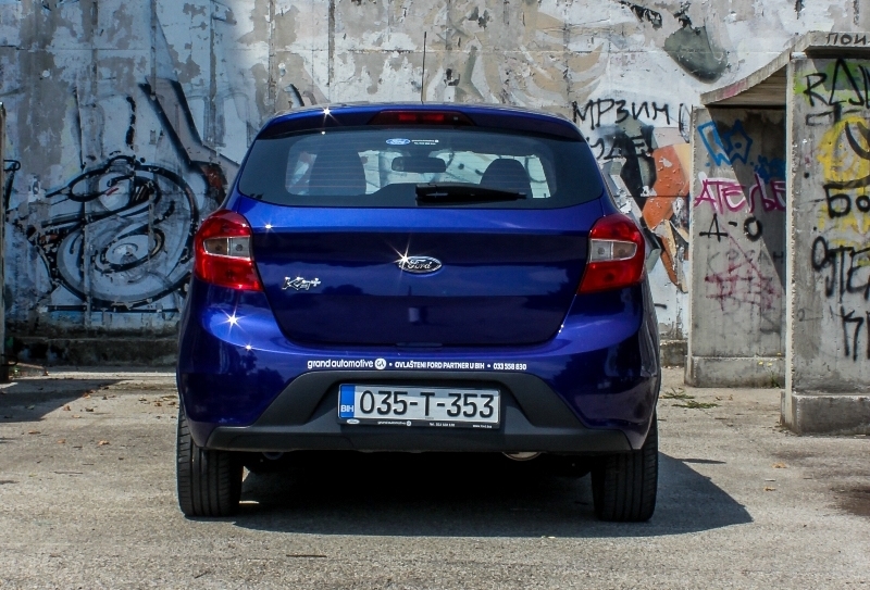 opreme, koji je obogaćen opcionom i dopadljivom metalik plavom bojom. Njegov dizajn snažno se oslanja na Fiestine i Focusove linije, ali nije ni izbliza proporcionalan kao što je to slučaj sa dva veća modela, koji imaju dinamične kompaktne forme. Prednji dio krasi prepoznatljiva lamelarna maska hladnjaka, koja osim na mnogobrojne Fordove neodoljivo podsjeća i na prestižni britanski Aston Martin. Glavna svjetla su originalna, ali istovremeno za nijansu prevelika za jedan mali gradski model. Na bokovima su u slučaju testnog modela u prvom planu veoma lijepi „lepezasti“ 16-inčni alu naplaci sa niskoprofilnim Hankook gumama dimenzija 195/45. Pozadina je veoma jednostavna, sa velikim petim vratima i ne baš tako velikim staklom, koje sužava vidno polje pri vožnji unazad. Dizajneri su u potrazi za što funkcionalnijom i prostranijom kabinom morali istovremeno da povećaju karoseriju, pa je najviša krovna tačka kod Ka+ pet centimetara viša nego kod Fieste. To je uslovilo da najmanji Fordić na prvi pogled izgleda značajno uži od nje, mada se stvarna razlika mjeri sa tek 31 mm. U praksi će vam zbog ovog dimenzijskog „debalansa“ oči, dok se ne naviknete, sugerisati da bi Ka+ izgledao skladnije da je još samo „malo“ širi.