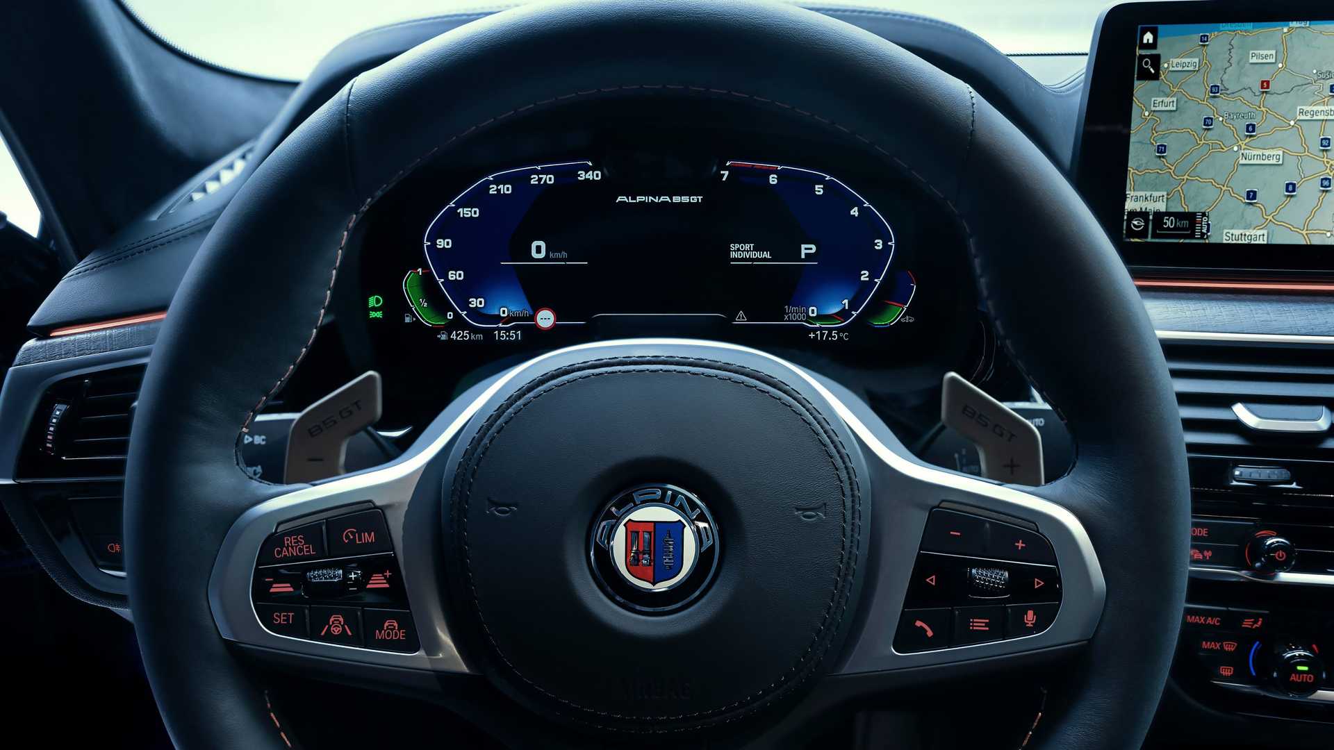 Sa zadnje strane vire dvije dvostruke izduvne cijevi, obložene titanijum nitridom koji im daje crnu završnu obradu. Alpina nudi B5 GT sa svojim klasičnim dizajnom točkova od 20 inča i 20 krakova koji je lakiran isključivo u Marron Volciano. Alpina će ponuditi B5 GT u standardnoj plavoj ili zelenoj boji eksterijera, međutim, tjuner će ponuditi i šest specijalnih: Arctic Race Blue, Petrol Mica, Verde British Racing, Chalk, Imola Red i Daytona Violet. U unutrašnjosti, Nappa koža je standardna, ali je dostupna i potpuna Merino koža, zajedno s brojnim opcijama ukrasa i drugim nadogradnjama unutrašnjosti, poput Alpininih ukrasa od oraha i antracita.