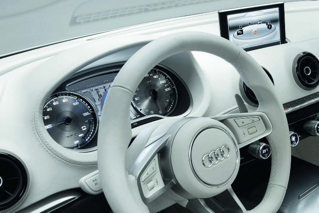Unutrašnjost A3 bit će identična konceptu A3 e-tron prikazanom na Shanghai Motor Show. Dakle bijela koža će pšokrivati ploču s instrumentima na kojima će se isticati četiri velika otvora za zrak.