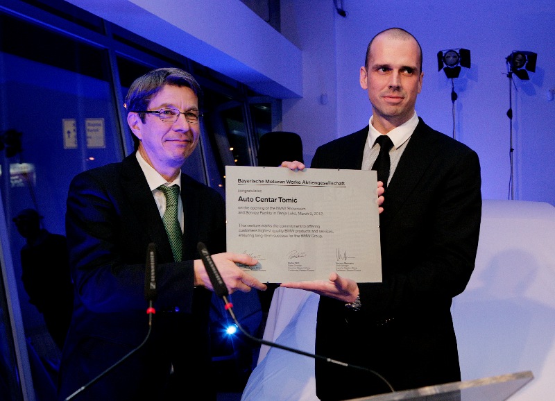 Svečanost otvorenja centra u Banja Luci održana je u petak, 09.03.2012. godine kojom prilikom je brojnim uzvanicima i medijima predstavljen novi BMW serije 3. Prigodni govor prilikom otvaranja održao je gospodin Krešimir Raspudić, direktor Auto centra Tomić za Bosnu i Hercegovinu. Visoki predstavnik BMW Group gospodin Vincenz Resmann tom je priikom uručio plaketu zahvale predsjedniku Nadzornog odbora Dr.-Ing. Danielu Tomiću čime je centar i službeno proglašen otvorenim.Šesta generacija ovog najprodavanijeg premium automobila u svijetu predstavljena je javnosti u tri osnovne linije: Sport Line, Luxury Line i Modern Line. Sve ove linije pružaju kupcu poseban doživljaj uz mogućnost stapanja individualnih preferencija s odabirom automobila prema svojim željama i potrebama. Pažljivi izbor opreme koji obuhvaća i vanjske dijelove kao i izbor materijala i boja u unutrašnjosti posebno je definiran za svaki pojedini model.
